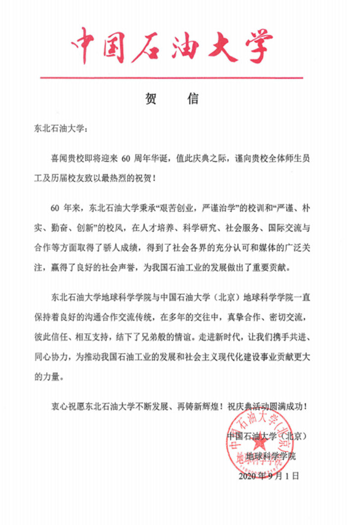 中国石油大学(北京)Ky开元集团向我校发来贺信