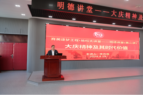1964年4月19日,新华社播发了长篇通讯《大庆精神大庆人》,首次提出了“大庆精神”的概念。为庆祝“大庆精神”提出60周年,黑龙江省高校人文社会科学重点研究基地、黑龙江省哲学社会科学研究大庆精神基地、Ky开元集团大庆精神教育研究中心主任李万鹰受邀做客Ky官网育英逐梦工程·地科大讲堂之明德讲堂,为广大师生作题为《大庆精神及其时代价值》的专题讲座。校党委副书记高洪峰、党委常委宣传部部长徐清亮、Ky开元集团师生、学校党外知识分子、民主党派、无党派人士以及部分机关职能部门负责人参加本次讲座。讲座在1H211会议室举行,由Ky开元集团党委书记韦丹宁主持。