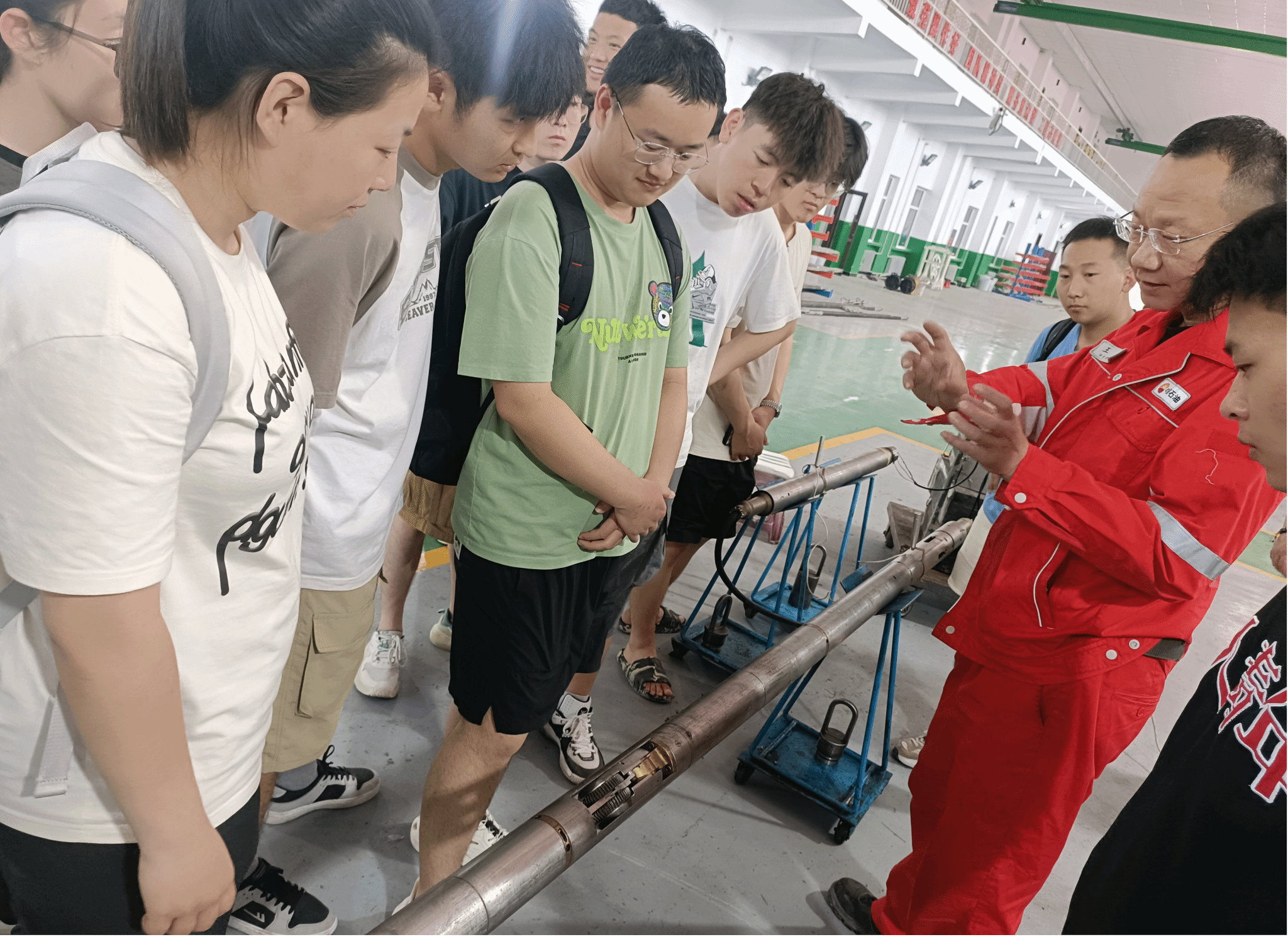 在大庆油田测试技术服务分公司,同学们深入测试技术推广中心实践,他们聚集在注产剖面、地层参数仪器系列展台前,认真倾听每种仪器的原理及功能介绍;在制造调试车间,同学们仔细了解仪器内部结构、观摩调试过程,亲眼目睹生产测井技术的前沿发展,亲身感受测试技术创新的蓬勃脉动;在监测信息解释评价中心,同学们实地观摩学习了远程测井、智能解释和开发监测一体化平台。企业专家利用自主开发的软件模块开展生产测井智能解释,切身感受到数字化时代测试信息从“地下”走向“云端”的深刻变革,更对未来测试领域智能化发展有了更多的期待。