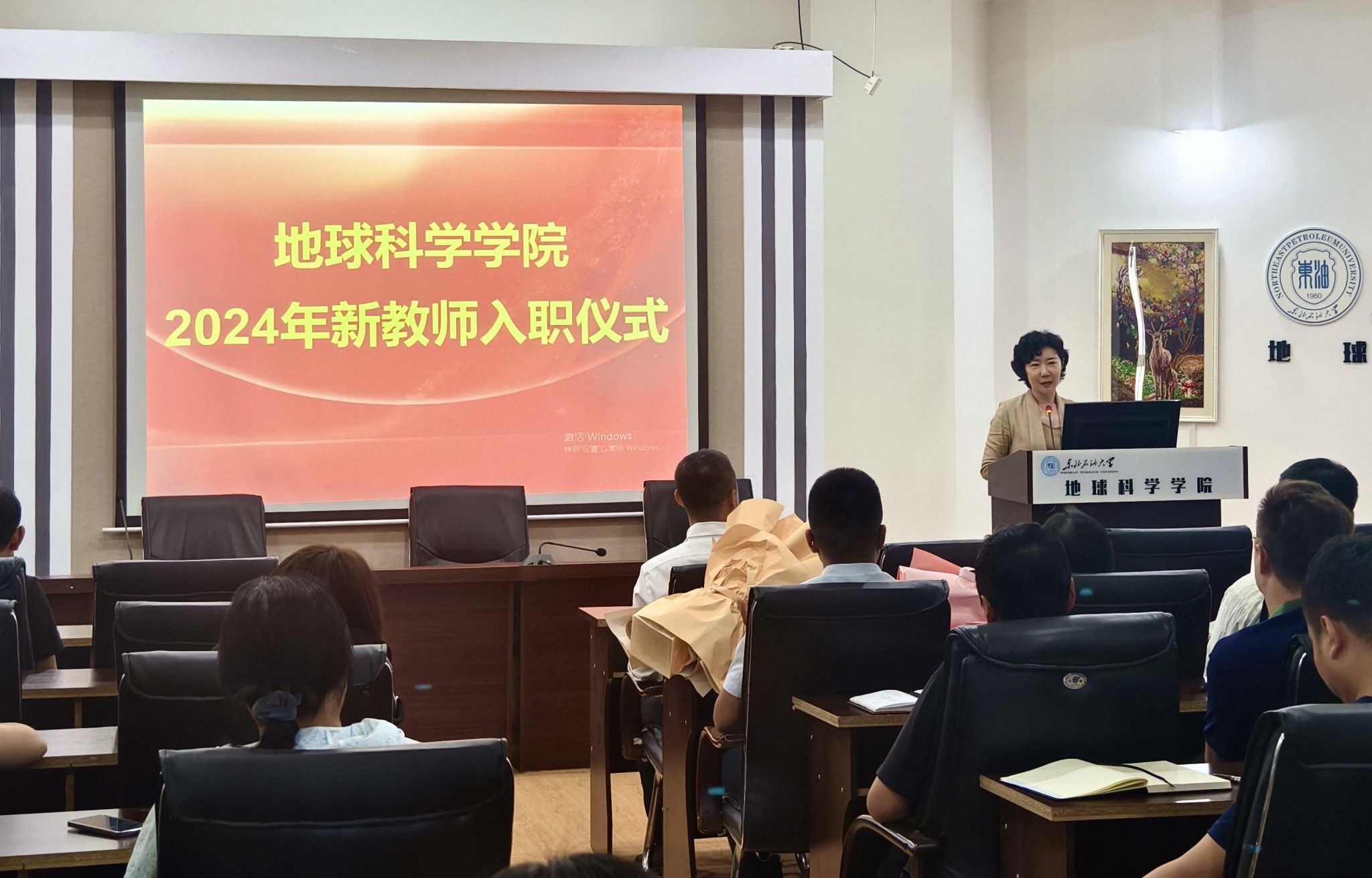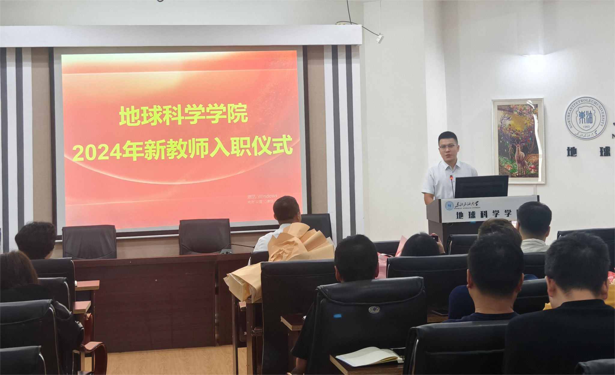 首先,王钢对三位新教师的基本情况进行了介绍,并代表学院对他们加入表示欢迎。蒋飞、史集建、魏华彬代表三级单位为新教师献上纪念徽章与鲜花。