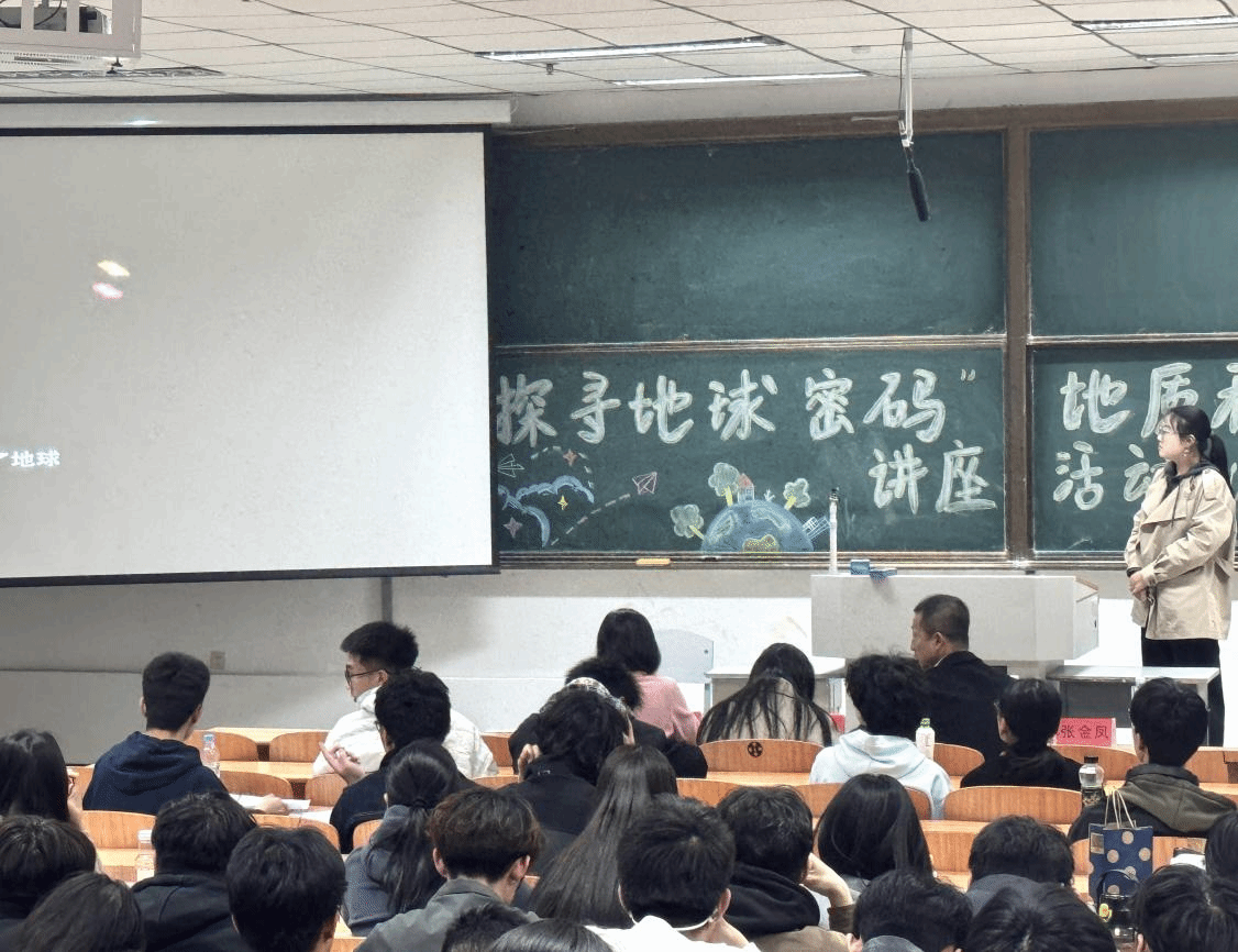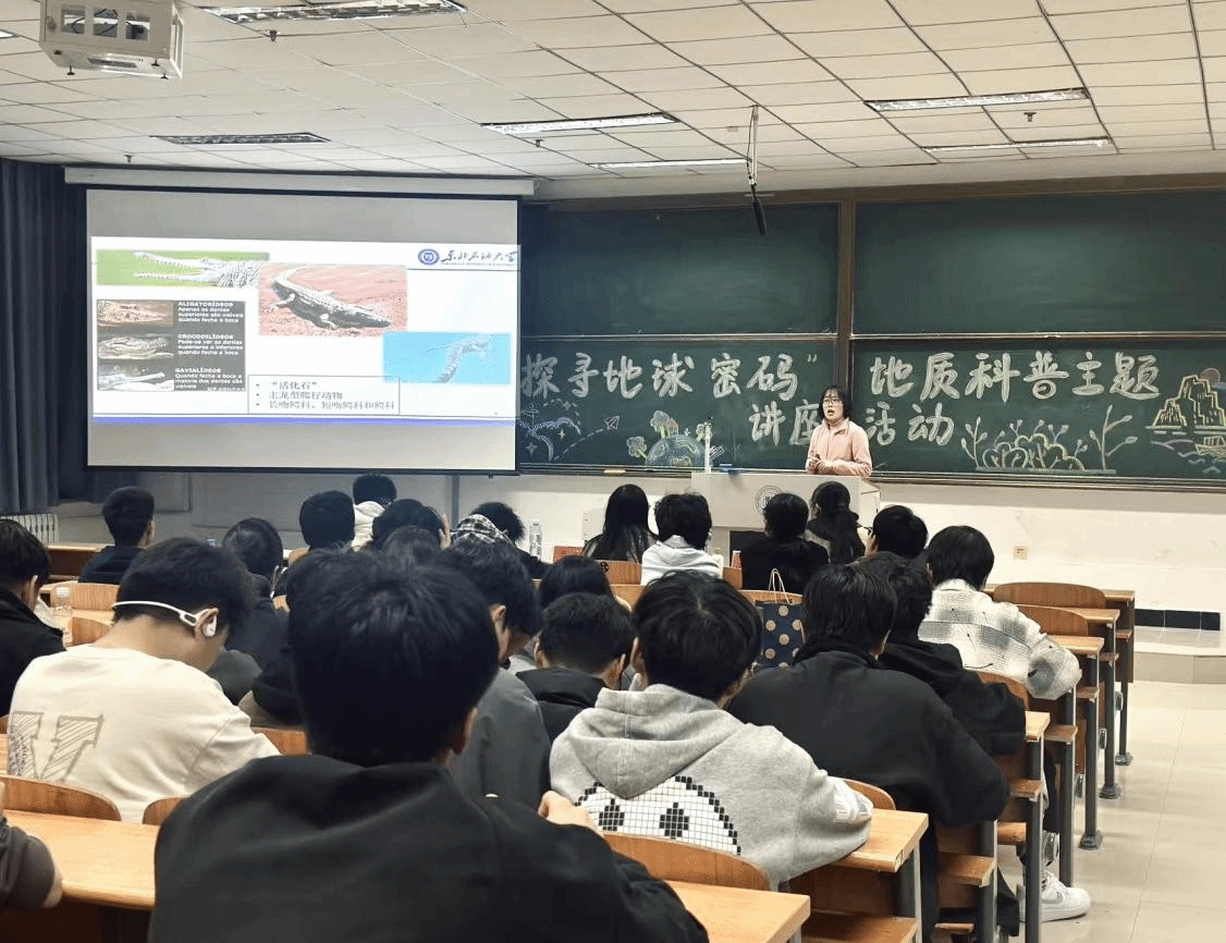 在地质科普讲座中,地信系教师张金凤和资勘系教师乔羽分别以《地球的前世今生》和《真鳄与“假”鳄》为题为同学们做科普分享,为同学们展示地球宝贵的不可再生资源。呼吁师生敬畏地球、珍惜资源、科学应对挑战!